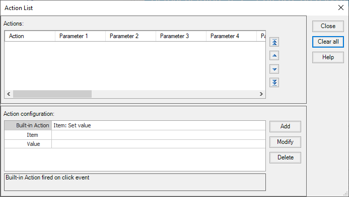 The "..." button related to the Action List field provides access to the homonymous configuration window to define the actions that make up the list: