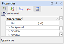 PagesAnimationsOptionButton, Combo, ListBox animations Combo specific properties:Appearance category In the Appearance category you can define the list of available options. List Allows access to the configuration dialog of the available options, as described later in this chapter.