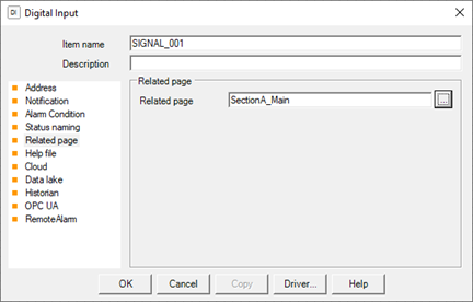 It is possible to associate an alarm with the most significant page that will be recalled by the Go to page command in the Event list / Somamrio alarms