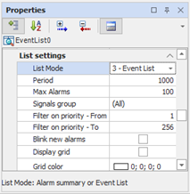 Display Filter. At runtime will display only alarms with priority within the specified range. For example, setting Filter Priority - From to 1 and Filter Priorities - To 100, the list will display only the alarms with priority between 1 and 100, including, but will not be visible alarms prioritized by 101 to 256. |