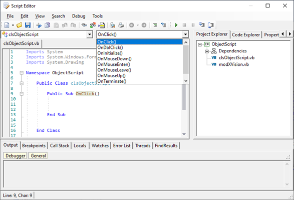 The predefined procedures for managing events are available in the Procedures list. By selecting a procedure from the list, the declaration is automatically inserted into the code: