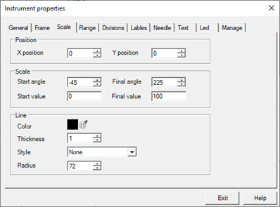 The properties of the Scale category allow to define the appearance of the dial of the instrument.