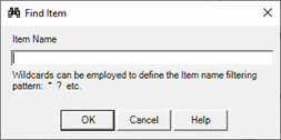 Specify the name of the item searched; you can use "wildcard" (see "Wildcards" inside chapter "Common editing") to define a generalized search criteria.