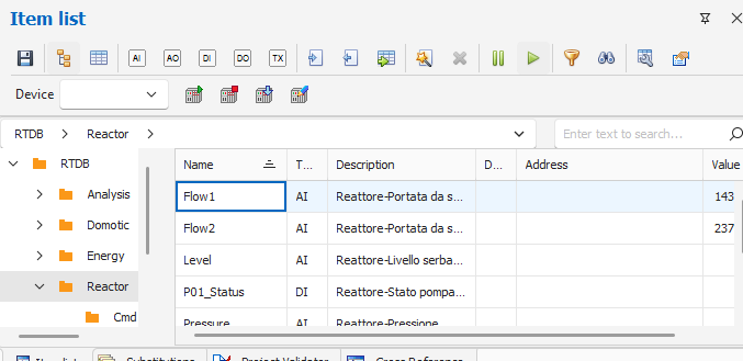 The editor of the RealTime Database allows you to view the list of Items and perform all the operations of creation, modification, deletion, and search.
