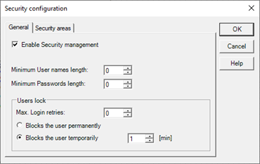 In a new project, security management is enabled by default. To change the enabling status of the security manager and to configure the general parameters, select the Security item from the Configure menu: the system displays the dialog shown in the figure: