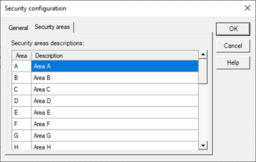 The Security Areas tab allows you to define descriptions for the 27 security zones (identified by the letters A to Z) available in the system.