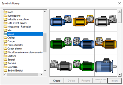 In the left part of the window displays the categories of available symbols. A context menu provides controls for creating, renaming and deleting categories, while the buttons on the bottom of the window allow the management of the symbols belonging to the selected category, which are displayed in the right area.