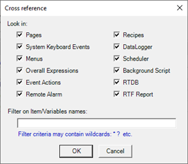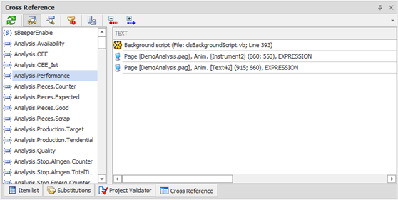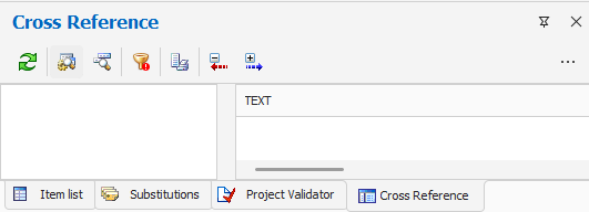 The Cross Reference dockable window creates a report that locates Items and the Local Variables referenced in the main elements of the current project.