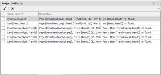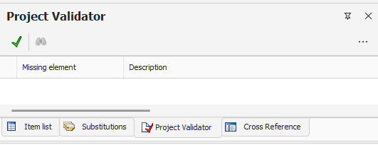 The Project Validator window allows you to perform a formal check of the project, highlighting any missing items: