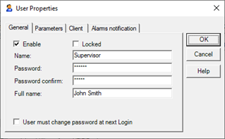 The window has three tabs. The General tab allows you to configure the properties of general data and enabling user.