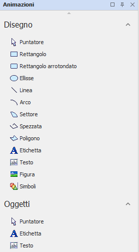 Le animazioni sono suddivise in due categorie: Disegno e Oggetti.