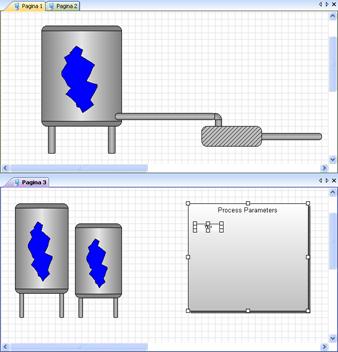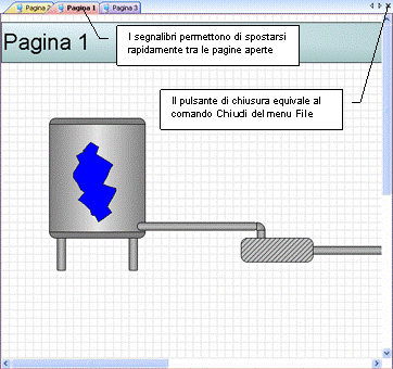L’area di disegno ospita le pagine sinottiche in fase di sviluppo. X-Editor è un ambiente MDI (Multiple Document Interface): consente cioè di lavorare con più pagine aperte contemporaneamente, e di copiare elementi da una pagina all’altra. Per ogni pagina aperta viene visualizzato un segnalibro; per navigare tra le pagine aperte è sufficiente fare click sui segnalibri.