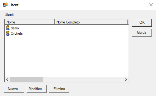 I pulsanti Nuovo, Modifica ed Elimina consentono rispettivamente di inserire un nuovo utente e di modificare o eliminare un utente esistente.