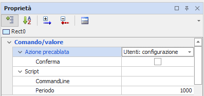 Per richiamare la finestra di configurazione utenti è necessario impostare, per la proprietà Azione dell’elemento, l’opzione Utenti:Configurazione.