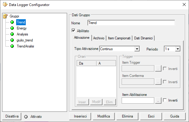 Configurazione dei gruppi di campionamento La configurazione dei gruppi di campionamento avviene mediante l’apposito configuratore integrato in X-Editor. Per accedervi selezionare il comando DataLogger dal menu Configura.