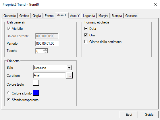 È possibile configurare le proprietà dell’asse X , quali le proprietà della scala dei tempi e il formato grafico dell’asse, nella scheda Asse X: