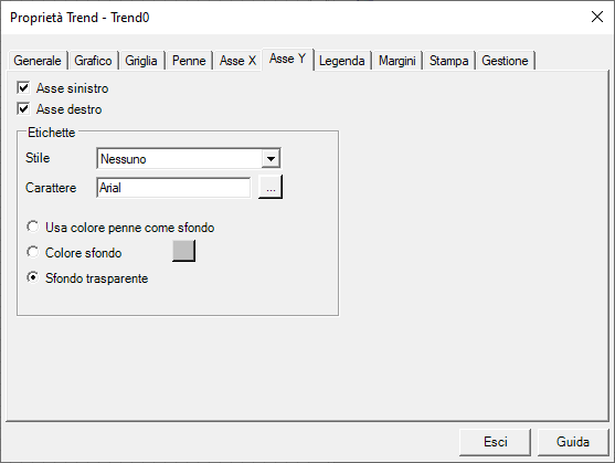 L’asse verticale (asse Y) ospita le scale delle grandezze monitorate. Per ciascuna grandezza possono essere configurate differenti impostazioni di scala: in fase di run-time, selezionando una grandezza nella legenda, l’asse Y mostra la scala definita per quella grandezza.