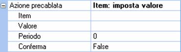 A seconda dell’azione selezionata vengono resi disponibili uno o più campi di configurazione che consentono di definirne i parametri di esecuzione: ad esempio, per l’azione Imposta Item, il nome dell’item da impostare ed il valore a cui impostarlo.
