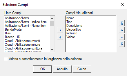 La lista Lista campi mostra l’elenco dei campi non visualizzati; la lista Campi visualizzati mostra l’elenco dei campi attualmente visualizzati, in ordine di visualizzazione.