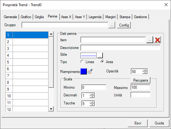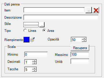 Con il termine Penna si intende l’insieme dei dati di input e di formato relativi alla tracciatura di un andamento: item visualizzato, scala, formato della linea, formato delle etichette…