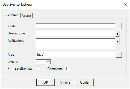 La finestra Dati Evento Tastiera consente la configurazione di un nuovo evento di tastiera o la modifica delle proprietà di un evento già configurato.