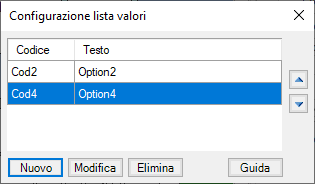 I pulsanti Nuovo, Modifica ed Elimina consentono di inserire, modificare o rimuovere un’opzione. I pulsanti di spostamento verticale presenti a destra della lista consentono di modificare l’ordine delle opzioni definite, che determina il valore impostato per l’item associato se la proprietà Modo Selezione è impostata a Indice. La prima opzione ha indice 0.