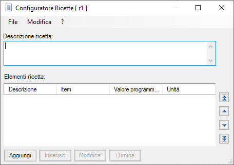 La finestra del Configuratore Ricette presenta i seguenti campi e comandi, diversamente disponibili secondo la modalità operativa: