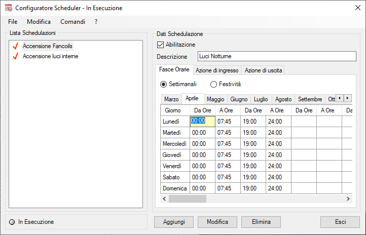 Di seguito è mostrato come configurare i giorni settimanali del mese di Aprile (che coinciderà con la configurazione dei mesi di Maggio, Giugno, Luglio, Agosto e Settembre) per ottenere l'accensione delle luci notturne dalle 19:00 alle 6:30 di tutti i giorni della settim