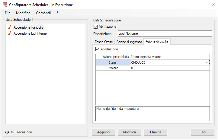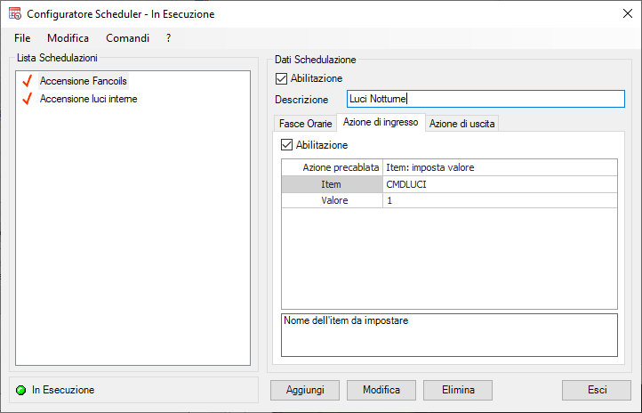 - attivare l’item CMDLUCI all’ingresso nella fascia oraria (impostazione del valore a 1)