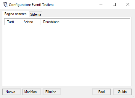 Gli eventi da tastiera di Pagina sono validi esclusivamente quando è visualizzata la pagina per cui sono configurati; gli eventi da tastiera di Sistema hanno validità in tutte le pagine.