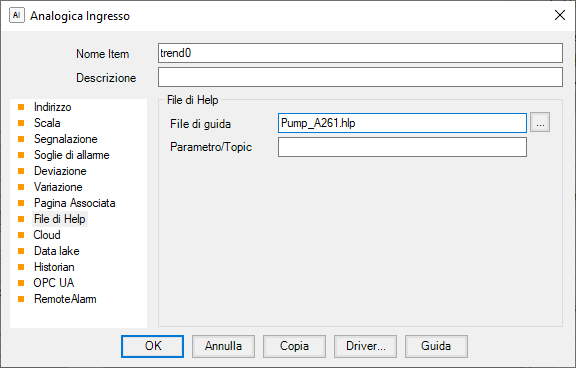 In fase di configurazione è possibile associare a ciascun item di tipo Analogico o Digitale un file di help contestuale contenente informazioni utili sull’evento, basate ad esempio sul manuale operativo dell’impianto. Selezionando il comando Guida di un’animazione Lista Eventi (se abilitato) il sistema visualizza il file di aiuto associato all’item cui si riferisce la segnalazione selezionata.