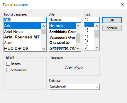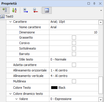 La tabella delle proprietà consente di modificare la formattazione sia accedendo alla finestra di dialogo Formato Testo, sia modificando i singoli attributi. Le proprietà relative alla formattazione del testo sono definite nel nodo Carattere sotto la sezione Aspetto: