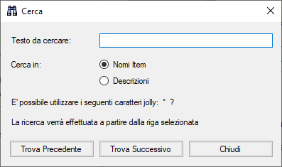 3. Digitare la stringa da cercare e specificare se la ricerca debba essere eseguita fra i Nomi Item o tra le Descrizioni.