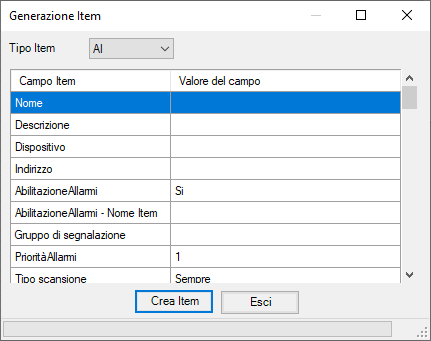 Nota: L’utilità di Generazione Automatica consente di inserire gruppi di item di un solo tipo per volta (Analogico, Digitale, Testo).