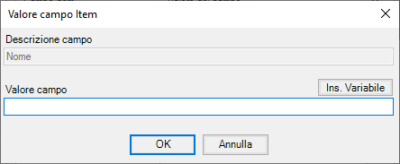 5. Facendo doppio click su ciascun campo viene visualizzata la finestra di immissione Valore Campo Item, per l’inserimento del valore.
