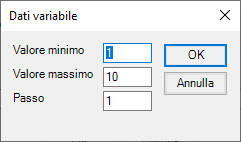5. Specificare, inserendo i valori Valore Minimo e Valore Massimo, l’intervallo di valori da attribuire alla variabile. Nel campo Passo specificare l’intervallo di valori tra un indice e il successivo. Premere OK per confermare, Annulla per abbandonare l’operazione.