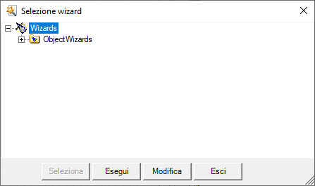 I pulsanti Modifica ed Esegui consentono rispettivamente di attivare il wizard selezionato o di editarne il codice. Avviando un wizard il controllo passa al wizard selezionato fino al termine dell’esecuzione.