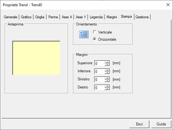 Gli oggetti Trend sono in grado di eseguire autonomamente la stampa dei grafici visualizzati. Le impostazioni di stampa sono configurabili modificando le proprietà definite nella scheda Stampa delle proprietà del grafico: