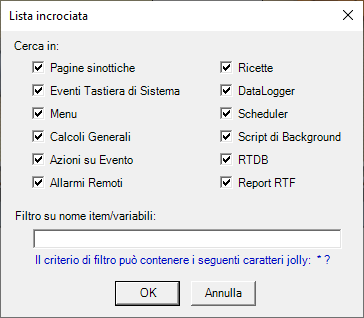 La Lista Incrociata non viene aggiornata dinamicamente: occorre pertanto utilizzare il comando di aggiornamento per generare o aggiornare il rapporto. Selezionando il comando Aggiorna il sistema procede alla ricerca dei riferimenti. È possibile limitare la ricerca ai soli elementi che interessano e filtrare per nome i riferimenti estratti: