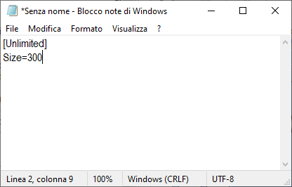 4. Accedere al file RTDB.INI ed inserire la dimensione desiderata alla voce Size nella sezione [Unlimited], come nell’esempio seguente: