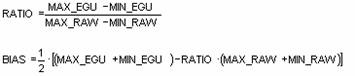 Dato l’intervallo del valore grezzo (MIN_RAW e MAX_RAW) e il corrispondente intervallo del valore convertito in unità di ingegneria (MIN_EGU e MAX_EGU), i valori di Ratio e Bias possono essere calcolati come segue: