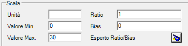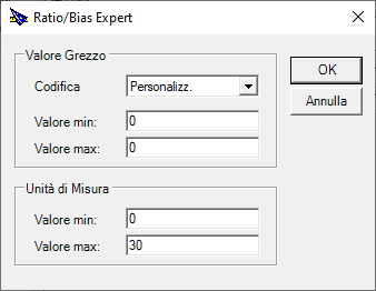Specificando gli estremi dei due range di valori (grezzo e in unità di ingegneria), l’Esperto Ratio/Bias calcola automaticamente i valori di Ratio e Bias, e chiudendo la finestra con OK compila i corrispondenti campi della finestra di configurazione dell’item.