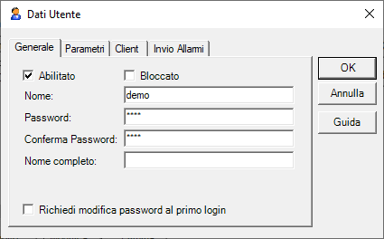 Un operatore può richiedere la modifica della propria password agendo su un elemento di comando eventualmente predisposto. La modifica della password può essere effettuata solo dopo la connessione dell’utente e richiede comunque l’inserimento del nome utente e della password precedente. La finestra di modifica della password è illustrata nella figura seguente: