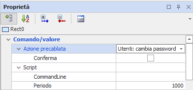 Per consentire all’utente di modificare la propria password è necessario prevedere un apposito elemento di comando (animazione, menu o evento da tastiera) per il quale sia stata configurata l’azione Utenti: Cambia Password.