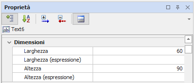 Le proprietà della categoria Dimensioni consentono di specificare le dimensioni correnti dell’animazione ed eventualmente di specificare le espressioni che permettono di ridimensionarla dinamicamente in base al valore assunto. Le dimensioni sono espresse in pixel.