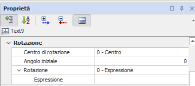 Le proprietà del gruppo Rotazione permettono di definire l’angolo di rotazione iniziale dell’animazione ed un’eventuale espressione per variare dinamicamente l’angolo di rotazione in fase di visualizzazione. Consentono inoltre di definire la posizione del centro di rotazione.