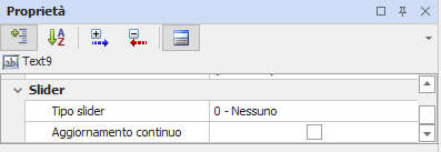 Le proprietà della categoria Slider consentono di configurare l’oggetto per utilizzarlo come cursore (slider): consente cioè di rendere l’oggetto trascinabile con il mouse verticalmente, orizzontalmente o lungo entrambe le direzioni, variando di conseguenza il valore di un item.