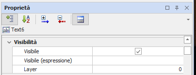 Le proprietà della categoria Visibilità permettono di definire la visibilità iniziale e l’eventuale espressione per il controllo dinamico della visibilità dell’animazione; specificano inoltre il piano di disegno (Layer) di appartenenza della stessa.