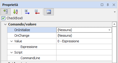 Proprietà specifiche CheckBox: categoria Comando/Valore La proprietà Item nella categoria Comando/Valore consente di definire l’item controllato dalla CheckBox. Item Specifica il riferimento ad un item o Variabile Locale il cui valore sarà visualizzato ed impostato a 0/1 dall’animazione