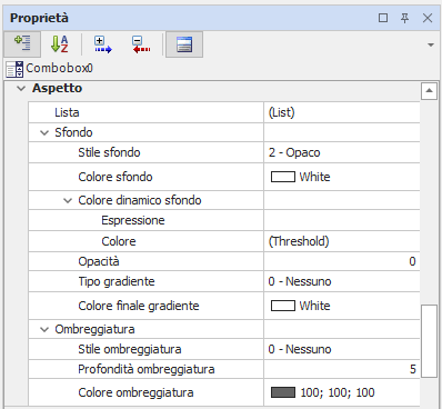 Proprietà specifiche Combo: categoria Aspetto Nella categoria Aspetto è possibile definire la lista delle opzioni disponibili. Lista Permette di accedere alla finestra di configurazione delle opzioni disponibili, descritta più avanti in questo capitolo.